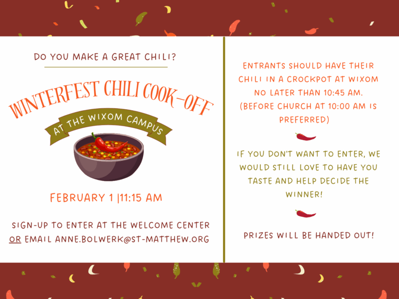 This event is a great way for St. Matthew and Hearts and Hands children to celebrate this Winter season! There will be winter-themed activities for the family to enjoy and a nice hot-dog lunch (and chili to judge)! If weather permits, please bring a sled as well for sledding and dress warm as this event will have activities outside. Let it snow!